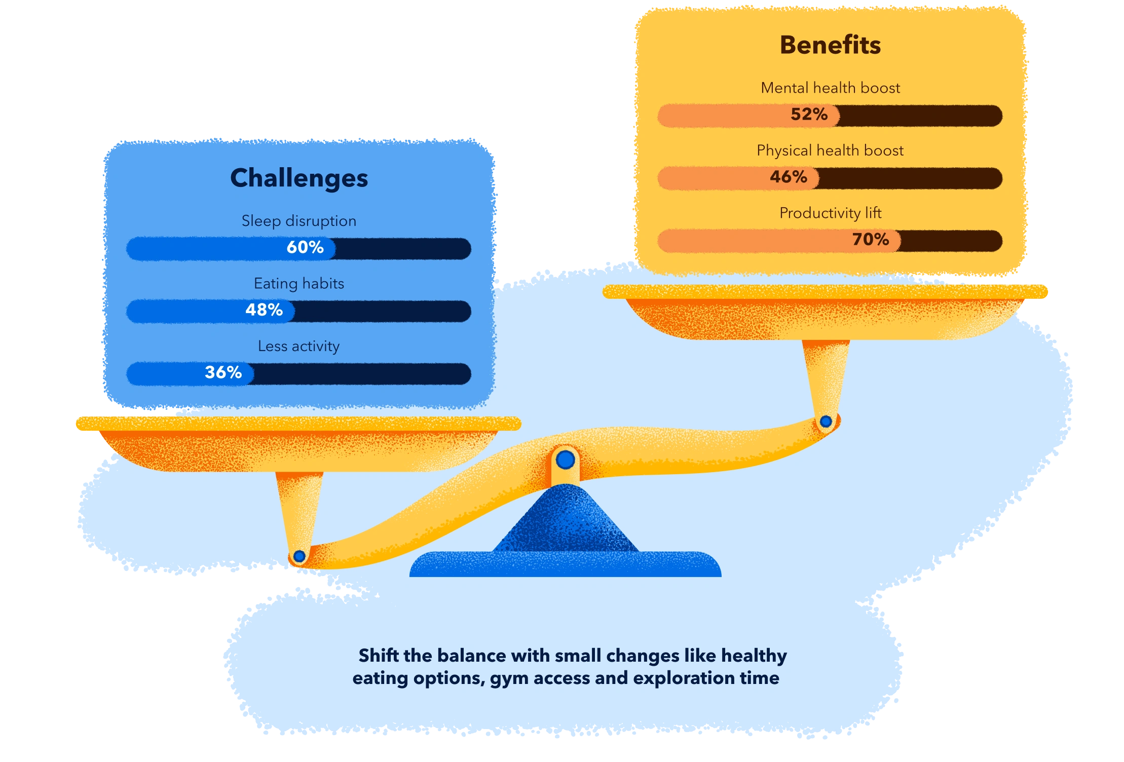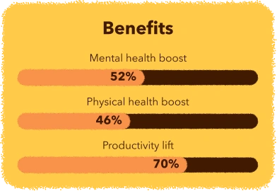 In fact, more than half of the travellers we surveyed say work trips boost their mental (52%) and physical (46%) health,[8] and 70% find them positive for productivity.[9] On the flipside however, travellers reported that things like disrupted sleep (60%) and changes in eating habits (48%) do take a toll on their wellbeing.
