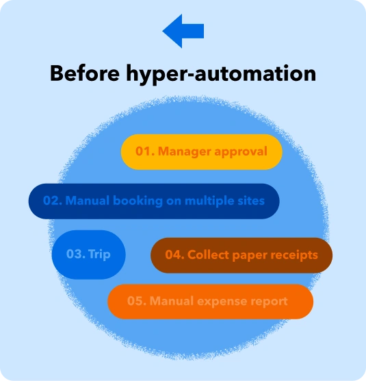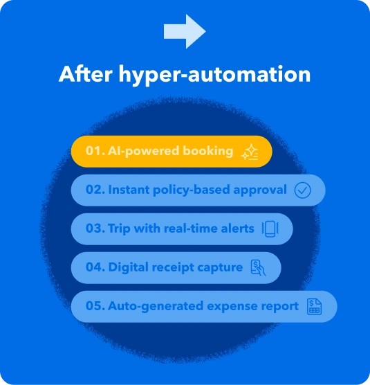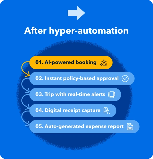 Hyper-automation combines AI, machine learning and robotic process automation to handle complex processes with minimal human intervention. In relation to business travel, AI-driven tools will learn from your company’s booking, approval and reimbursement patterns.