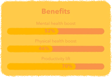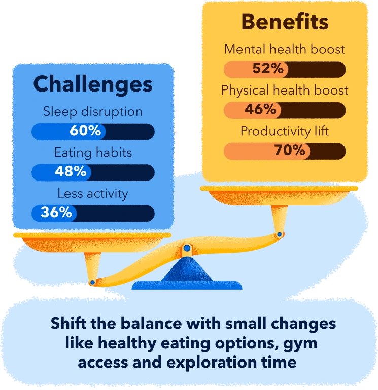 In fact, more than half of the travellers we surveyed say work trips boost their mental (52%) and physical (46%) health,[8] and 70% find them positive for productivity.[9] On the flipside however, travellers reported that things like disrupted sleep (60%) and changes in eating habits (48%) do take a toll on their wellbeing.