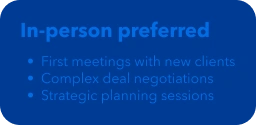 When thinking about financial aspects, will the revenue generated by a face-to-face meeting be greater than the cost of the trip itself? Will things move quicker in person? If so, then budgeting for that time together is worth it.