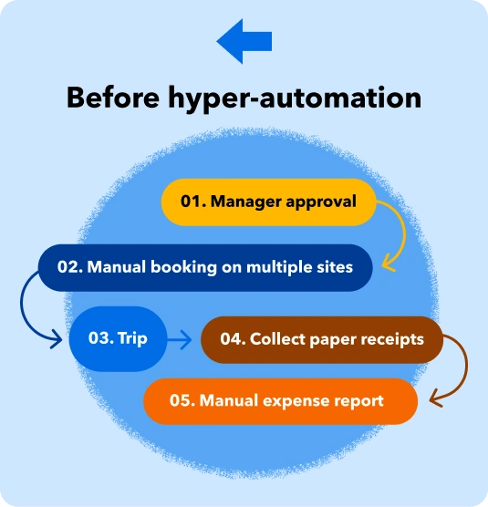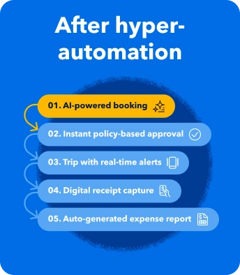 Hyper-automation combines AI, machine learning and robotic process automation to handle complex processes with minimal human intervention. In relation to business travel, AI-driven tools will learn from your company’s booking, approval and reimbursement patterns.